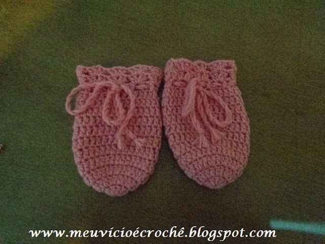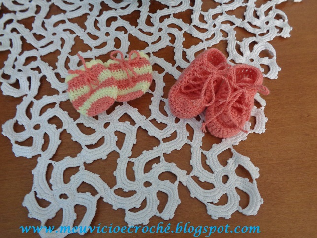 É rápido de se fazer, por isso dá pra fazer pra doar. Fica muito bonito. Aqui fiz também os sapatinhos e o gorro pra completar o conjunto. Não sou boa pra pap, até postei invertido. Espero porém que tenha ficado claro