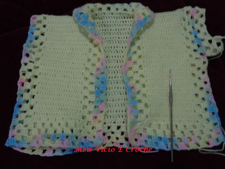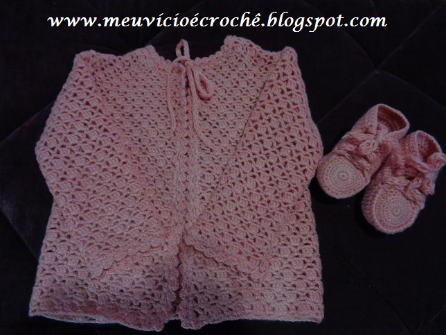 Fiz um pap desse casaquinho há anos atrás e tentei refazer para que crocheteiras que estão iniciando possam faze-lo pois é fácil. Está em postagem antiga no arquivo. Quem quiser tem os dois pra comparar. Ganhei amostra de uma prima que já deve ter feito centenas dele pra doação e eu também já fiz vários, mas menos.